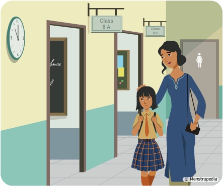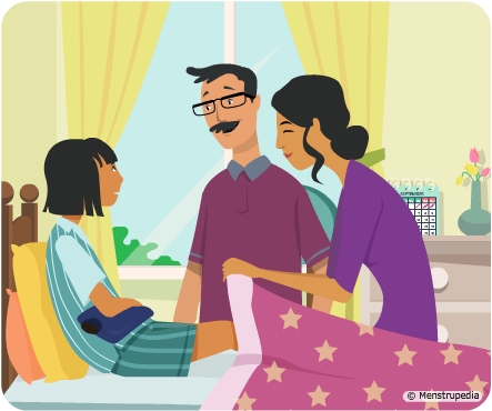 Ask her about her concerns or fears, how it happened, or anything else she may want to let you know. Allow her to share whether she is experiencing pains, irritation or mood swings. Find solutions to minor discomforts by offering her food or water, hot water bag for pains, ice-cream for upliftment, etc. Listening to her lets her know that you are approachable and are there to fulfil her needs. It will also remove any sense of nervousness that she might be going through.