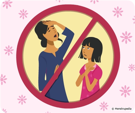 Make conversations around her first period less scary, especially when they are about cramps, pains, health issues, side-effects or allergies, pre-menstrual syndrome, leaks, etc. It is good to make her aware, but ensure that she can view periods in a realistic way, and not as something that will only bring her bad experiences. Normalise periods as much as you can, and establish that it is a natural, healthy part of growing up.